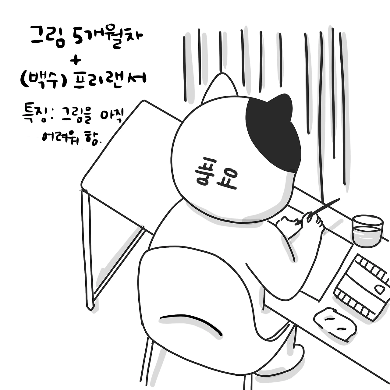 아직 아이패드에서 예쁜 선 그리기가 쉽지 않기 때문에 밑그림은 종이에 그렸다. 동그란 표현에 조금 더 신경 쓰고 비율에도 신경을 썼다. 처음이라 업로드에 의의를 두자고 생각했다.