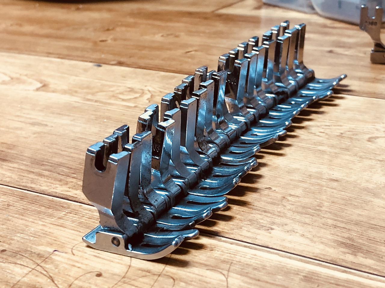 이 노루발은 높이가 다르다. 지들끼리 사이좋게 기대앉은 것 같아 보이는데, 낱개로 봤을 때는 터미네이터 같더니 모아놓고 보니 귀엽(?)다. 용도는 모서리 부분을 박을 때 일정한 간격으로 예쁘게 박음질해준다. 오른쪽에 스프링이 있어서 눌렀다 떼면 재미있다.