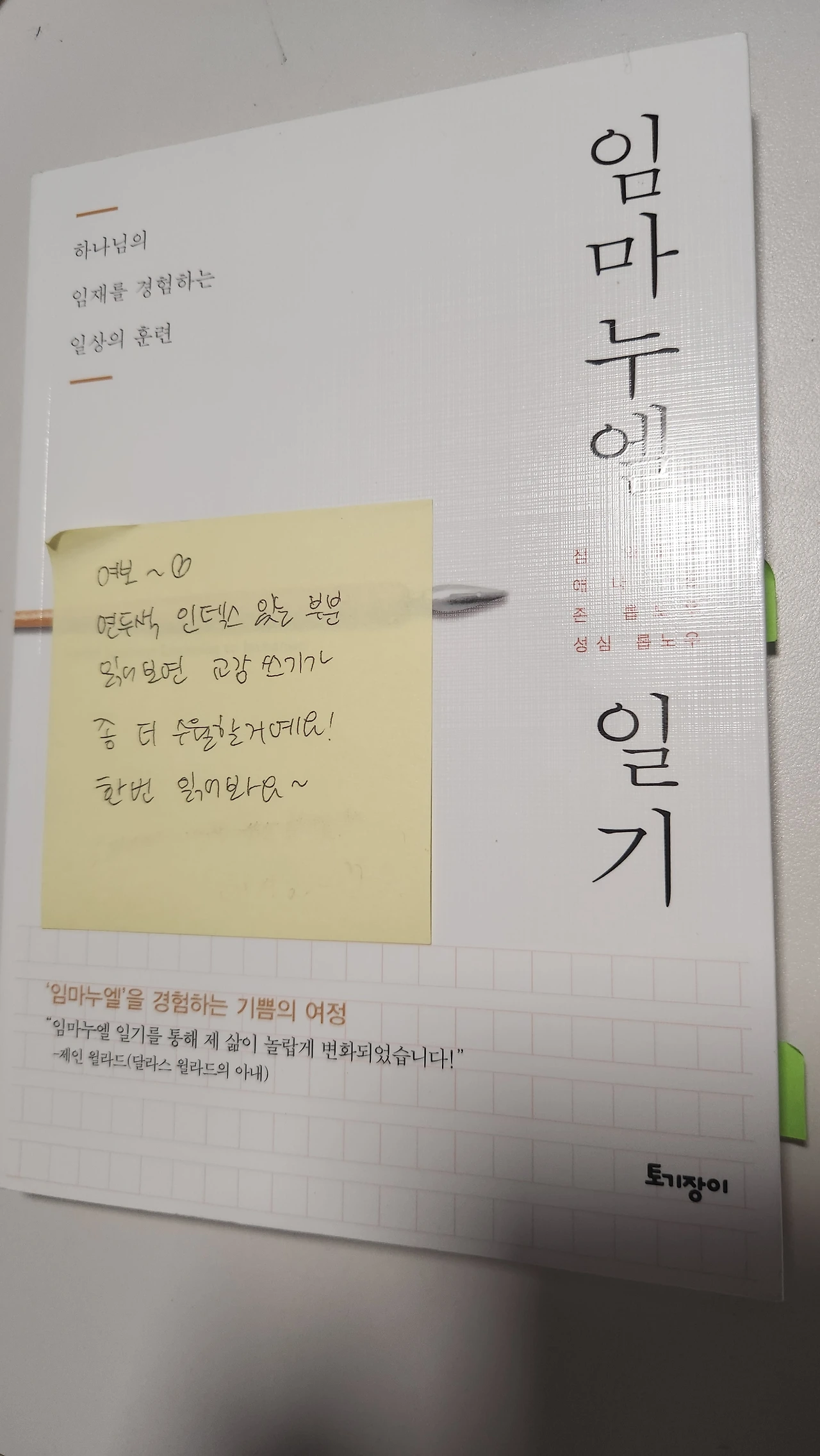 2. 사랑하는 아내가 제 책상에 포스트잇 편지와 함께 책 한권을 올려 놓았습니다. 요즘 교감 이라 불리는 교류적 감사기도 훈련을 하고 있는데, 막히는 부분이 있어 고민이 된다고 말을 했더니 책을 추천해 준 것입니다. 아내가 표기해 둔 부분을 읽어보니, 순식간에 고민이 해결되었습니다. 머리로 이해 되면 바로 행동으로 옮기는 저의 특징을 잘 알고 지혜롭게 남편을 이끌어 주었습니다. 함께 한 시간이 오래일수록 서로를 더 깊이 잘 알아갑니다. 한나에게 감사합니다.