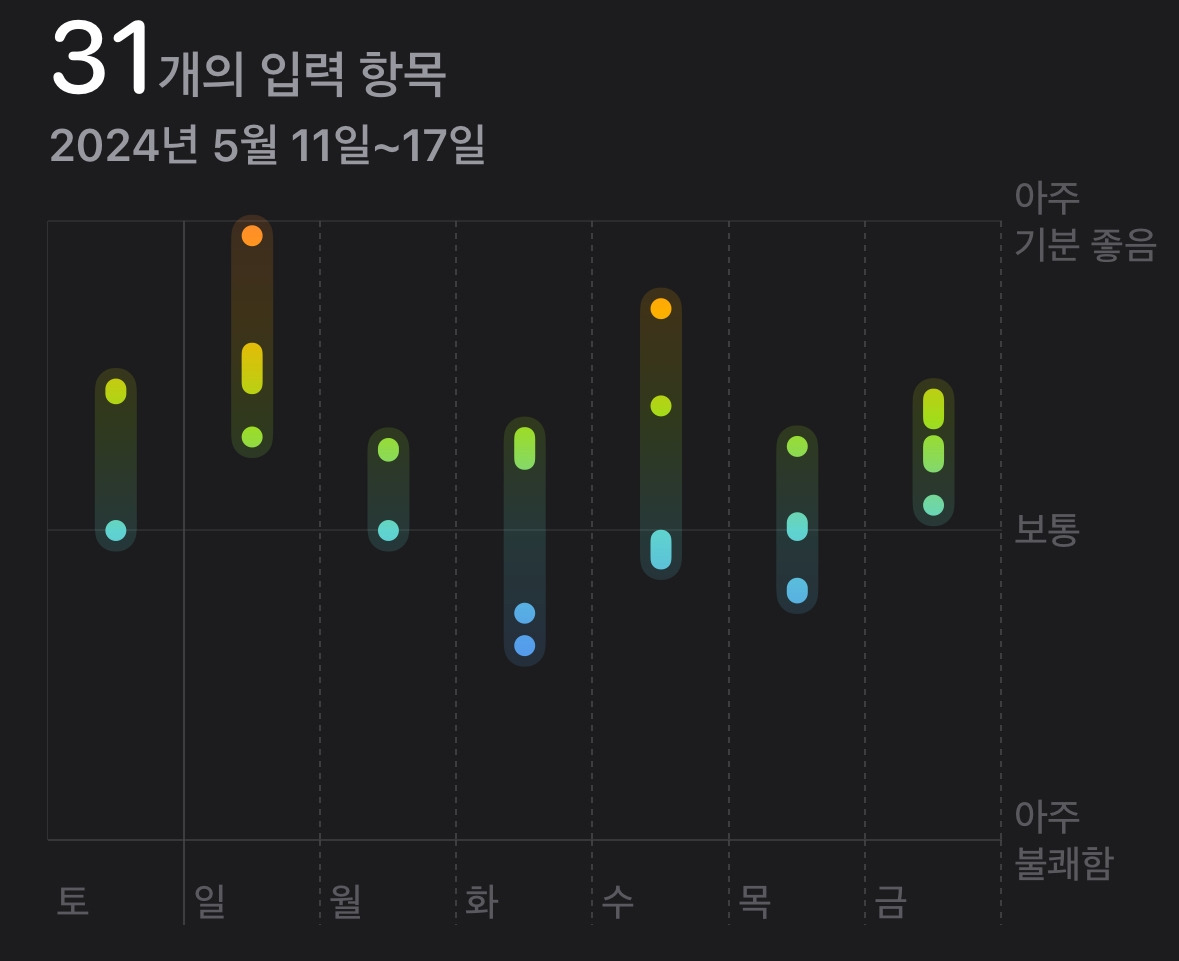 기록한 결과를 보면 역시 감정은 하루에도 큰 폭으로 변한다. 특히나 일요일과 월요일의 감정선을 보면 재미있다. 어쩔 수 없는 직장인의 삶인가 싶다. 보통이라면 금요일에 좋은 감정들이 기록되어야 할 텐데 이 주에는 신경 쓰이는 일이 생겼다. 일주일의 삶이 고스란히 드러나는 것 같았다.