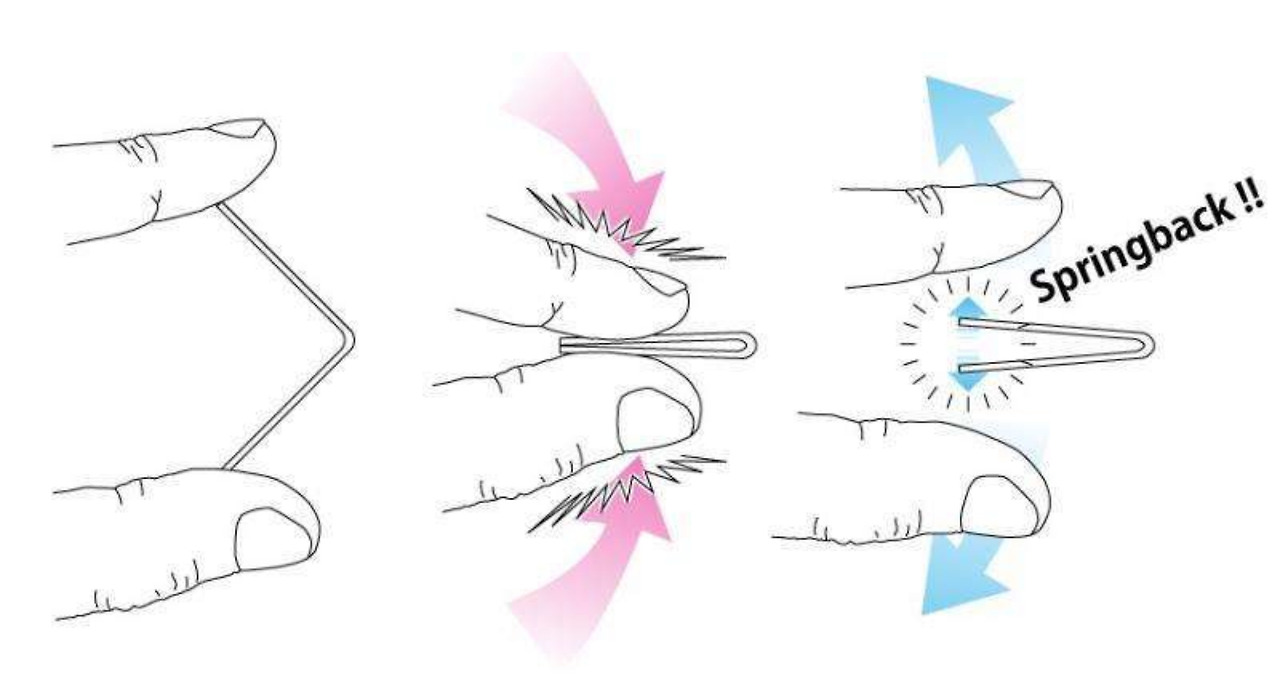 내가 원하는 변화는 100이어서 100에 해당하는 힘을 주었지만, 변화는 그에 못 미칠 수 있습니다. 정확히는 변화가 덜 일어난 게 아니고, 변화가 일어났지만 일부가 다시 원래 상태로 복원된 겁니다. 이런 현상을 ’스프링백‘ 이라고 합니다. 철사를 손으로 구부렸다가 손을 놓으면 구부렸던 양보다 덜 변형되는 걸 경험해 보셨을 겁니다. 이런 현상을 말합니다. 재료가 갖고 있는 ‘복원력‘ 때문입니다. 복원력이 강할수록 스프링 백현상은 강하게 일어납니다. 외부로부터 받은 스트레스로 변형이 생기고, 그 변형을 유지하려는 ‘소성‘과 변형에서 복원되려는 ’탄성‘ 이 둘 사이의 관계에 의해 최종적인 변형량이 결정됩니다.