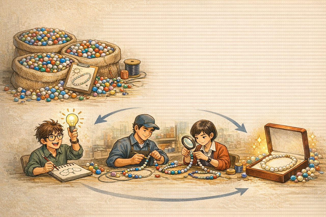 아이디어도 비슷합니다. 아무리 좋은 생각이 많아도 구현되지 않으면 가치는 생기지 않습니다. 회의 시간에는 아이디어가 풍부한데, 돌아보면 실제로 마무리된 결과물이 거의 없는 경우를 종종 봅니다. 꿸 줄을 모르는 상태일 수도 있습니다. 혹은 아이디어를 현실로 옮기는 과정에서 필요한 인내와 성실함, 그리고 예상보다 지루한 문제들을 끝까지 감당할 에너지가 부족한 것일지도 모르겠습니다.