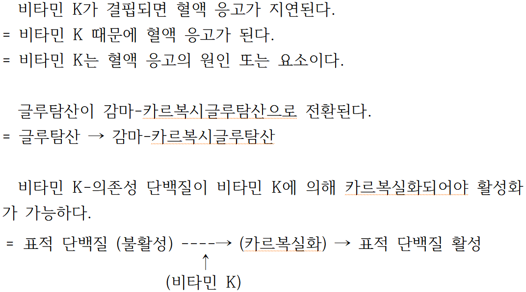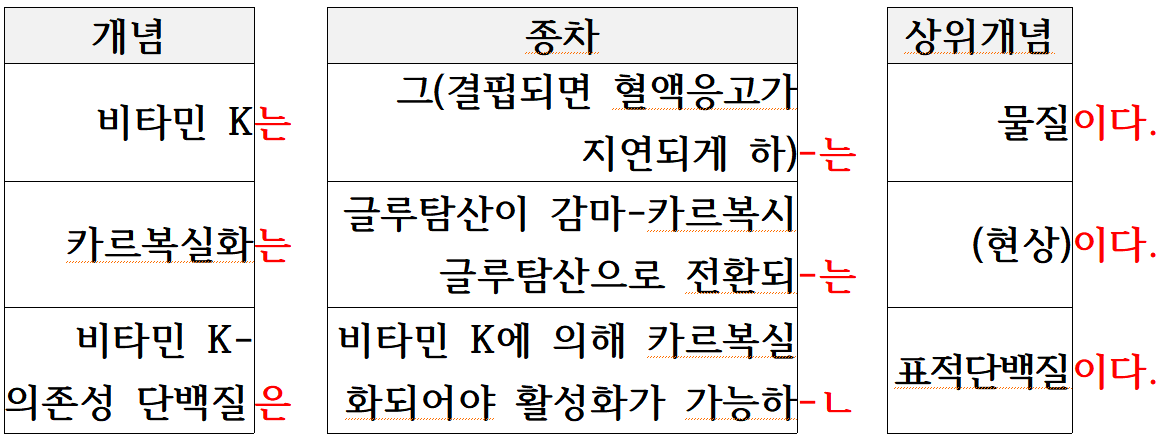 지문의 ‘그 물질을 비타민 K로 명명했다.’, ‘카르복실화는 … 글루탐산이 감마-카르복시글루탐산으로 전환되는 것을 말한다.’, ‘비타민 K에 의해 카르복실화되어야 활성화가 가능한 표적 단백질을 비타민 K-의존성 단백질이라 한다.’ 등은 개념들을 정의하는 문장들이고 이를 종차, 상위 개념을 파악하기 위해 표준 형식으로 바꾸면 다음과 같다.