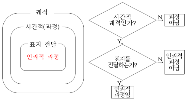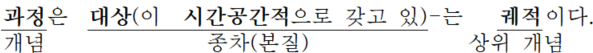 지문에서 ‘과정은 대상의 시공간적 궤적이다.’라고 했는데, 이는 ‘과정’에 대한 정의로서, 다음과 같이 과정을 추상화하여 ‘궤적’이라는 상위 개념을 떠올린 것이다.(아래의 종차는, 뒤 체언이 나타내는 대상이 앞 체언에 소유되거나 소속됨을 나타내는 격조사 ‘의’의 기능을 고려해 변형한 것이다.)