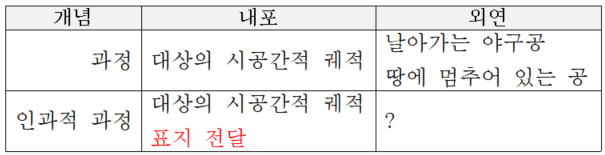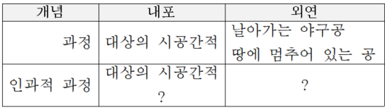 지문에는 ‘모든 과정이 인과적 과정은 아니다’라고 했는데, 이는 글쓴이가 ‘과정’ 중 ‘인과적 과정’이라는 개념으로 구체화하고 있음을 보여준다. 이때 철수 쌤이 신경 쓰는 것은 ‘A는 물론이고 B도’라는 문장 구조이다. 이 문장에서 A와 B는 반대 관계에 있는 경우가 많다. 지문에서도 ‘날아가는 야구공은 물론이고 땅에 멈추어 있는 공도’라고 하였는데, 날아가는 것과 멈추어 있는 것은 반대의 상황이다. 그렇다면 어느 하나는 인과적 과정의 외연에서 제외된다. 그래서 철수 쌤은 지문을 읽으면서 다음과 같은 표를 머릿속에 그리며 읽는다.