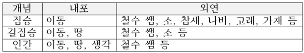 위의 표에서 ‘짐승’에서 ‘길짐승’을 거쳐 ‘인간’으로 갈수록 내포의 수가 하나[이동]에서 셋[이동, 땅, 생각]으로 늘어나고, 제외되는 것[소, 참새, 나비, 고래, 가재 등]만큼 외연은 그 수가 줄었다. 이런 사고를 구체화라 하는데, 일상생활에서는 ‘(범위를) 제한(국한, 한정)한다’고 말한다. 마찬가지로 ‘짐승’에서 ‘날짐승’, ‘참새’로, ‘짐승’에서 ‘물짐승’, ‘고래’로 범위를 좁혀가는 것도 구체화이다.