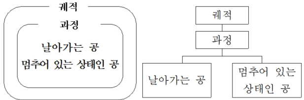 이를 보면 과정은 궤적의 하위 개념이지만, 날아가는 공과 멈추어 있는 상태인 공의 상위 개념이 된다. <철수 쌤의 슬기로운 국어 공부II>에서 철수 쌤은 개념을 가족에 비유하기를 좋아한다 했다. 이를 고려하면 과정이라는 개념에게는 궤적이라는 부모가 있고 두 가지 경우의 공이라는 자식이 있는 것이다.