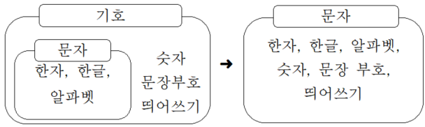 흔히 우리는 ‘문자’를 인간의 언어를 적는 데 사용하는 시각적인 기호 체계로서, 한자, 알파벳, 한글 따위라고 알고 있다. 이는 언어학에서 정의해 놓은 개념인데, 정보 통신 기술이 발전하면서 새로 정의해 사용하게 되었다. 이렇게 기존의 개념을 새로 정의해 사용한다는 것을 이해하지 못한다면 ‘띄어쓰기(⏘)가 포함된 18글자의 대상 문자열’을 이해할 수 없을 것이다. 왜냐하면 기존의 개념에 의하면 ‘띄어쓰기’는 문자에 포함되지 않기 때문이다. 띄어쓰기 뿐만 아니다. ‘한글:⏘’의 ‘:’도 문자가 아니라 문장부호이다. 그런데 정보 통신 분야에서 그것들까지 포함시켜 문자라고 하였다. 이는 외연의 확장, 즉 개념의 내포를 줄이고 외연을 늘리는 사고와 관련 있는데, 이를 벤다이어그램으로 나타내면 다음과 같다.