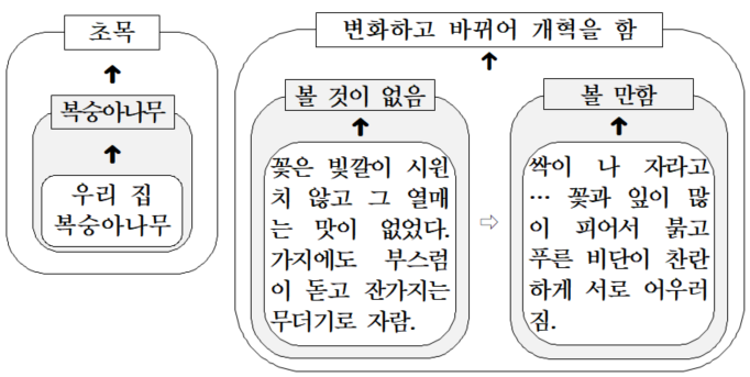 지문에서 글쓴이는 ‘우리 집 ⋯ 복숭아’라는 구체적 사례를 들었다. 그것이 ‘꽃은 빛깔이 시원치 않고 그 열매는 맛이 없었다. 가지에도 부스럼이 돋고 잔가지는 무더기로 자’랐다가 ‘싹이 나 자라고 ⋯ 꽃과 잎이 많이 피어서 붉고 푸른 비단이 찬란하게 서로 어우러’진 것을 관찰하고는, ‘볼 것이 없’었다가 ‘볼 만하였’다고 말한다. ‘볼 것이 없’다와 ‘볼 만하였’다는 접붙이기 전후의 우리 집 복숭아 상태를 일반화한 말이다. 글쓴이는 일반화를 멈추지 않고 더 나아가 복숭아가 속한 ‘초목’의 특성을 일반화한다. 즉 ‘볼 것이 없었다. ⋯ 볼 만하였다’를 ‘변화하고 바뀌어 개혁을 하게’ 된다고 일반화한 것이다. 이를 이해하는 데는 벤다이어그램만한 것이 없다. 아래 벤다이어그램에서 화살표를 따라 올라가 보라. 앞에서 설명한 하위 개념과 상위 개념을 생각하면서 말이다.