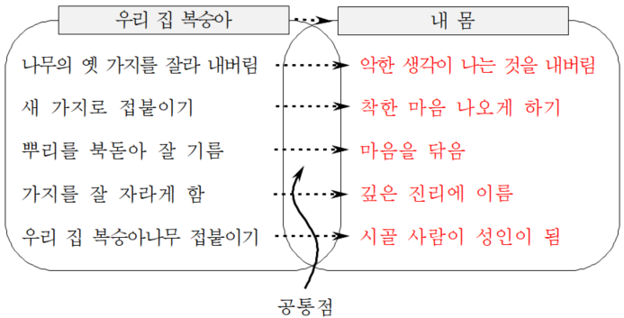지문에서 글쓴이는 ‘우리 집 ⋯ 복숭아나무’를 보고 ‘복숭아나무’의 속성을 일반화하고, 나아가 ‘초목’의 속성을 일반화하더니, 급기야 식물 범주가 아니라 윤리 범주에 속하는 ‘내 몸’, 즉 ‘성인에 이르는’ 길의 속성을 짐작하는 유추를 하고 있다. 글쓴이는 ‘악한 생각이 나는 것을 결연히 내버리는 일’은 ‘나무의 옛 가지를 잘라 내버리’는 일과 같고, ‘착한 마음⋯ 나오게 하기’는 ‘새 가지로 접붙이’는 것과 같다고 한다. 나아가 ‘뿌리를 북돋아 잘 기르’는 것을 ‘마음을 닦’는 것과 같고, ‘깊은 진리에 이’르는 것을 ‘가지를 잘 자라게 하’는 것과 같다고 한다. 그러면서 ‘시골 사람에서 성인에 이르’는 것을 ‘나무 접붙임과 다른 것이’ 없다고 한다.