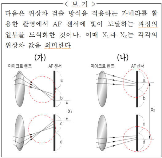 글을 읽으며 그림을 그릴 줄 아는 국어 능력이 있는 학생이라면 지문을 통해 ‘빛’을 나타내는 선이 ‘b’, ‘c’ 또는 ‘a’, ‘d’ 부분에 연결된다는 것을 그릴 수 있다. 그러나 그 학생도 빨간색 점선으로 된 동그라미(문제에는 없으나 설명의 필요에 따라 철수 쌤이 그려 넣은 것이다.) 속 선처럼 한 점으로 모였던 선이 다시 세 갈래로 나뉘어 AF 센서로 연결되거나 세 갈래 선이 한 점으로 모이지 않은 채 AF 센서에 연결되는 것은 그리기 쉽지 않다. 지문에 ‘수렴’은 세 개의 선이 하나의 점에 모이는 것이고, ‘퍼진다’는 것은 세 개의 선이 모이지 않은 상태를 말한다. 지문에 이런 내용이 있음에도 그것을 그림으로 쉽게 그리지 못하는 것은 빛에 대한 물리학적 지식을 갖고 있어야 하기 때문이다. 국어에서는 특정 과목에 대한 지식을 갖고 있는 학생만 유리하게 출제하지 않는다고 했다. 그래서 지문을 통해 쉽게 알 수 없는 내용은 <보기>의 (가), (나)를 통해 알려 준 것이다.