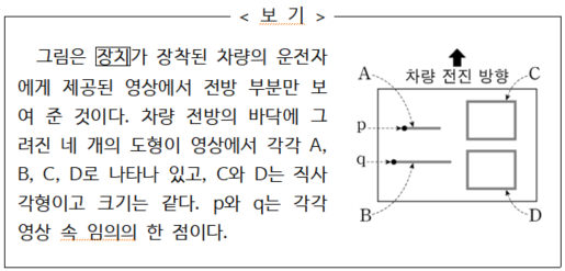 철수 쌤은 평소 하던 대로 지문을 읽으며 머릿속에 그림으로 그렸다. '차량 전후좌우에 장착된 카메라'를 고려해 (가)와 같이 그렸던 것이다. 그에 반해 '차량 주위 360°의 상황을 위에서 내려다본 것 같은 영상'에는 소홀했다. 특히 ‘주위’라는 말에는 아예 신경을 쓰지 않았다. 그러다 보니 자동차와 카메라만 생각하고 '차량 주위'를 생각지 않은 채 (나)와 같은 그림을 그리지 못했고, 나아가 <보기>의 그림이 (나)의 빗금 친 부분에 해당한다는 것을 알아내지 못 했다. 설령 그랬다 하더라고 <보기>에서 ‘전방’, ‘전진 방향’에 좀더 신경 썼더라면 (가)를 (나)로 수정해 이해했을 것이나 철수 쌤은 그러하지 못했다. 어휘 하나라도 놓치거나 오해하면 글의 내용을 잘못 파악하게 된다는 것을 철수 쌤도 새삼 느꼈다.