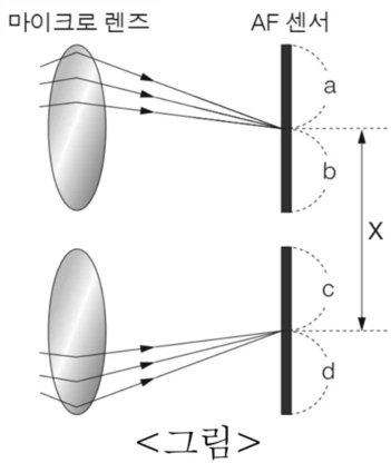 <그림>과 같이 한 쌍의 마이크로 렌즈를 지난 빛들이 각각의 AF 센서 표면의 한 점에서 수렴되면, 이 두 점 사이의 간격인 위상차 값 X가 광학적으로 이미 결정되어 있는 위상차 기준값과 일치하게 되어 AF 센서는 초점이 맞았다고 판단한다. 하지만 <그림>의 상황과 달리 마이크로 렌즈를 지난 빛들이 AF 센서에 도달하기 전에 수렴하게 되면 빛들은 각각 AF 센서의 b 영역과 c 영역에 퍼져서 도달한다. 이 경우 측정된 위상차 값은 정해진 위상차 기준값보다 작아지기 때문에 초점을 맞추기 위해 촬영 렌즈를 뒤로 이동시킨다. 반대로 마이크로 렌즈를 지난 빛들이 AF 센서에 도달할 때까지 수렴하지 못하게 되면 빛들은 각각 AF 센서의 a 영역과 d 영역에 퍼져서 도달한다. 이 경우 측정된 위상차 값은 정해진 위상차 기준값보다 커지기 때문에 초점을 맞추기 위해 촬영 렌즈를 앞으로 이동시킨다.