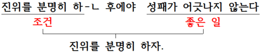 ‘A 후에(야) Bㄹ 수 있다’는 문장이 주장, 의견을 말하는데 그렇게 느껴지는가? 이 문장은 A가 B이기 위한 조건임을 나타낸다. 조건을 살피면 주장, 의견을 알 수 있는데, 그것은 크게 다음의 표와 같다.