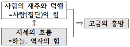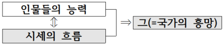 그런데 ‘A이고 B가 아니다’라는 문장 구조인 것으로 보아, ㄴ에서 두 주장은 반대 관계에 있다. ‘사림(士林)’은 유학을 신봉하는 사람(집단)이다. 그렇다면 ‘시세의 흐름’은 사람(집단)의 힘과는 다른 힘, 예컨대 하늘이 정해 놓은 이치나 역사 발달 과정의 흐름을 뜻하는 것으로 해석할 수 있다. 이를 고려하면 ㄴ은 다음과 같이 이해할 수 있다.