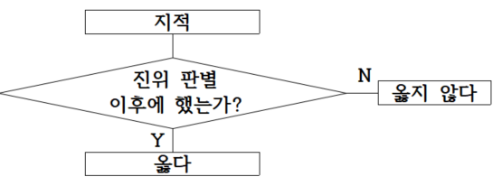 앞에서 ‘A는 B-아야/-라야/-어야/-여야 한다’고 하면 B가 A이기 위한 조건을 뜻한다고 했다. B가 있으면 A이고, 없으면 A가 아니라는 것이다. ①에서 ‘진의 멸망 원인에 대한 지적은 관련 내용의 진위에 대한 명확한 판별 이후에 이루어져야’ 한다고 했다. 이는 관련 내용의 진위에 대한 명확한 판별 이후에 진의 멸망 원인에 대한 지적은 이루어져야 한다는 것인데, 결국 진위 판별이 없으면 지적을 할 수 없다는 의견이다. 이 의견을 파악할 때는 시간의 순서를 고려하는 국어 능력이 필요하고 다음과 같은 판정도로 이해할 수 있다.