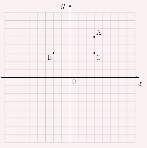 x축과 y축이라는 좌표축으로 이루어진 좌표평면에 점 A(3,5), B(-2,3), C(3,3)이라는 좌표를 표시한 예(단, x,y 축의 각 눈금이 1,2,3,… 일 때)