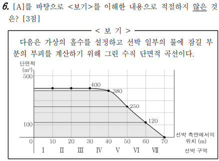 지문 설명을 그래프로 나타낸 예지문에서 말하는 ‘수평축’과 ‘수직축’을 흔히 x축과 y축이라 하므로, x축을 ‘선박 측면에서의 위치’와 ‘선박 구역’으로, y축을 ‘단면적’으로 하는 좌표평면을 위 그림과 같이 생각할 수 있다. 그리고 위치를 ‘x1, x2, x3, x4, x5, x6, x7’로, 구역을 ‘Ⅰ~ Ⅶ’로 나눴다. 여기서 x축을 '선박 측면 위치', '구역'이라 동시에 표시한 것이나 그것을 로마 숫자와 알파벳으로 달리 표현한 것은 개념을 구별하는 국어 능력과 관련 있는데, 이에 대해서는 추후 설명하겠다.