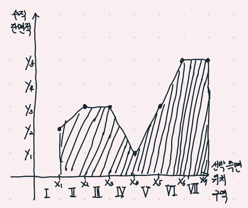 수평축은 일정한 길이의 구역으로 분할된 선박 측면에서의 위치로, 수직축은 선박의 수직 단면적으로 … 그래프에 점으로 나타낸다. … 점을 연결하면 단면적 곡선이 되는데 … 선 내부의 면적