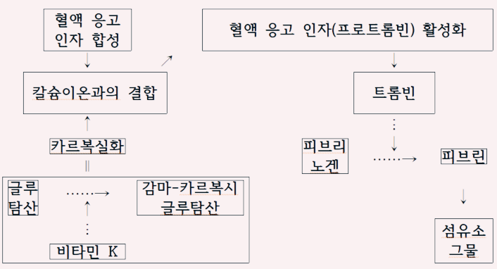 지문에서 ‘트롬빈’이 ‘피브리노겐’에서 ‘피브린’으로 바뀌는 것에 영향을 미치고, ‘비타민 K’가 ‘글루탐산’이 ‘감마-카르보시글루탐산’으로 바뀌는 것에 영향을 미친다는 것을 어떻게 그렸는지 눈여겨 보도록 하자.