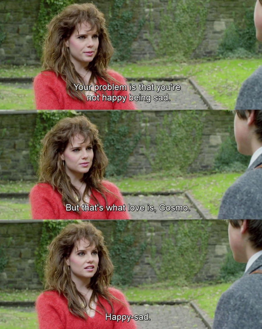 라피나는 영화에서 'happy sad'에 대해 말한다. 행복하지만 슬픈 것, 그게 사랑이라고 한다. 처음에 코너는 그 말을 이해하지 못하지만 이후 'Drive it like you stole it' 씬에서는 'happy sad'를 온몸으로 느끼는 모습을 보여준다. 나는 코너가 몇 안되는 엑스트라들과 강당에서 애써 뮤직비디오를 찍는 장면이 아니라, 오히려 모두가 행복하게 춤을 추는 장면이 슬펐다. 상상 속은 능숙하게 50년대 포크 댄스를 추는 잘 차려입은 사람들로 가득하다. 벡스터 선생이 덤블링을 하는가 하면 엄마 아빠가 사이좋게 춤을 추고, 라피나는 가장 예쁜 모습으로 나타나 코너를 바라본다. 하지만 현실은 상상과 완벽히 반대된다. 촬영을 위해 온 엑스트라들은 영화 <백 투 더 퓨처>를 본 적도 없고, 50년대 포크 댄스를 흉내내는 몸짓이 엉성하기만 하다. 엄마와 아빠는 예정대로 이혼할 거고 라피나는 오지 않는다.