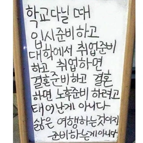나도 학교 다닐 때는 오직 대학을 위한 공부밖에 하지 않았다. 대학에서 많이 방황하기도 했지만 제일 비중을 많이 차지했던 건 취업준비였다. 그 이후의 과정도 삶에서 꼭 이수해야 하는 ‘필수과목’처럼 준비하며 살아갈 것이다. 인생에서 준비해야 할 것이 저 네 가지뿐이랴. 차도 사야지, 내 집 마련해야지, 몇 살이면 얼마 정도는 모아 놨어야지, 재테크해야지, 뭐 해야지. 남 눈치보기 좋아하는 대한민국에서 남들 다하는 것 안 하고 살기가 아주 힘들어 보인다.