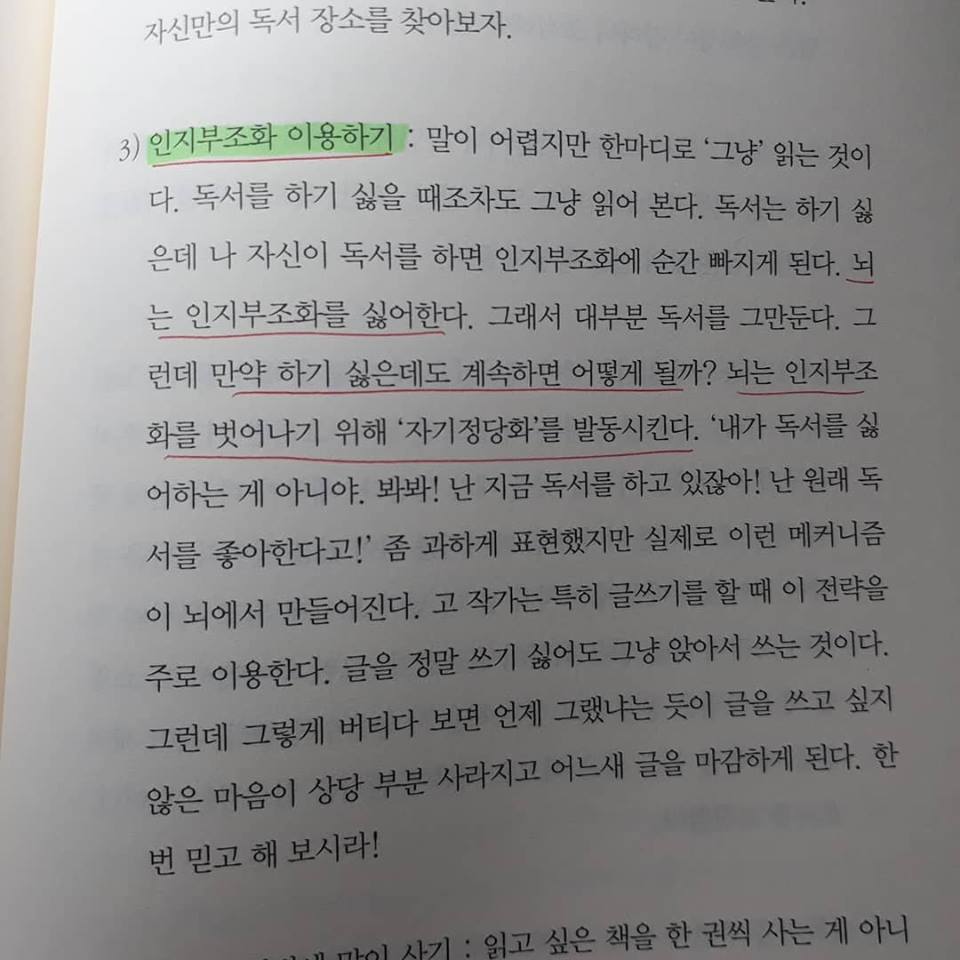 그럴 때는 ‘그냥 읽는’ 방법이 최선이다. 집중이 안돼도 그냥 ‘읽는 척’만 하고 있어도 괜찮다. 뇌는 책을 읽고 싶지 않아하지만 우리 눈은 책을 읽는다. 그러면 뇌는 ‘인지부조화’를 겪는다. 내 행동과 마음이 일치하지 않게 된다. 뇌는 인지부조화 상태를 싫어한다. 그래서 두 가지 방법으로 이 상황을 조정한다.