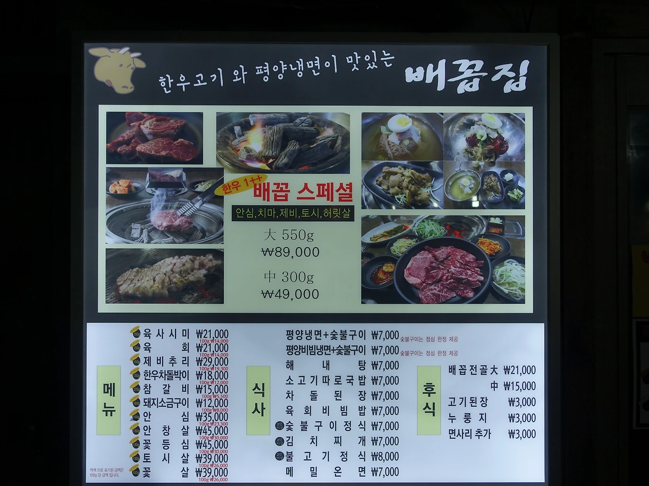 배꼽집의 메인 메뉴는 한우 투 플러스의 안심, 치마, 제비, 토시, 허릿살 부위로 구성된 세트 메뉴인 '배꼽스페셜' 입니다. 강남이라는 위치와 투 플러스라는 등급을 고려할 때 그렇게 부담되는 가격은 아닙니다.