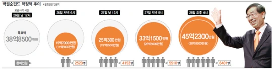 첫날 10억 원을 돌파하더니 개설 52시간 만에 45억 2,300만 원 약정에 실 입금액 39억 5,000만 원으로 성공리에 마감되게 됩니다. (박원순 펀드에 참여한 유권자는 총 6,401명입니다.) ▶관련기사