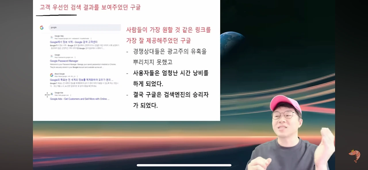 구글의 첫 혁신은 역시나 고객 경험의 혁신이었습니다. 검색시 검색자가 원하는 콘텐츠를 1페이지에 노출 시켜주는 알고리즘은 너무나 당연하게 보이지만 경쟁자는 하지 않은 전략이었습니다.