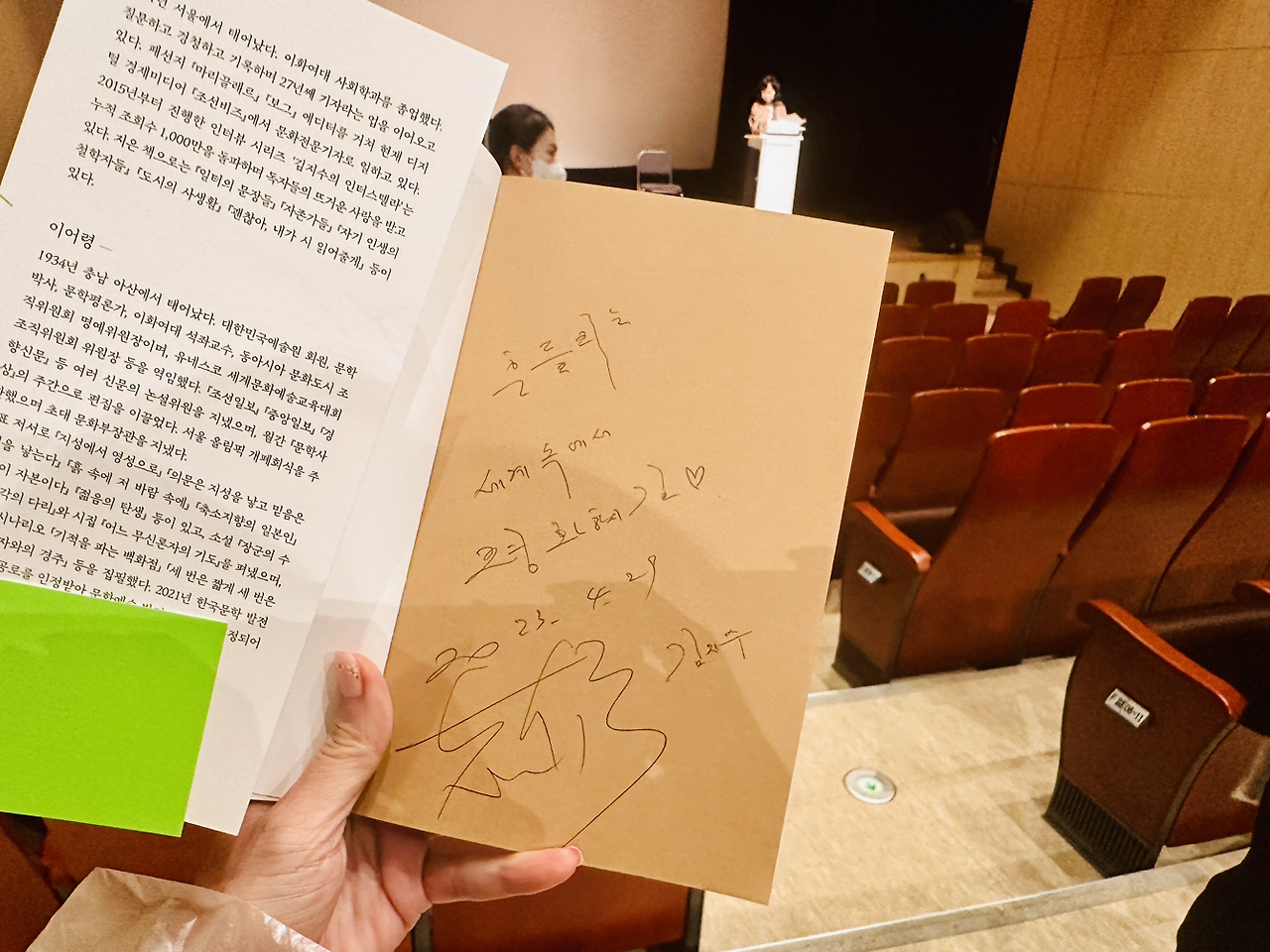 빛을 보고 같이 호흡하고, 그저 한 공간에서 지난함께하는 것으로 이렇게 종자기가 되었으니 이 얼마나 눈부실 일인가. 사전 신청한 질문이 뽑혀서 작가 친필 사인이 담긴 책을 받았다.