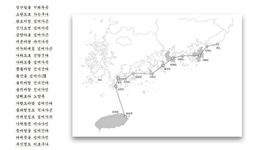 제주도 성산항(성산 일출봉)에서 출발하여 전라남도 소안도(所安島)·완도(莞島)·신기도(薪智島)·금당아(金塘島)·지누리대섬(未詳)·나라도(羅老島)·돌산(突山島)과 경상남도 남해(南海島)·노양목(露梁海峽)·사랑도(蛇梁島)·지제장심포(巨濟島 知世浦 長承浦)·가닥동끗(加德島)·다대끗(多大浦)을 거쳐서 부산(釜山) 영도(影島)에 닿는다.