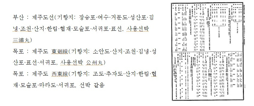 돛배로 이동할 때는 직선거리로 가장 가까운 곳을 선택했다. 발동선에 이어 제주-부산 항로가 개척되면서 이동 경로와 시간에 변화가 나타난다. 기선을 이용하여 부산 방면으로 갈 때는 소안도를 경유하지 않고 거문도를 경유하였고, 목포 방면으로 갈 때는 거문도 대신 소안도나 추자도를 거쳐 이동했다는 것이 관련 연구자들의 의견이다. 이러한 사실은 『조선총독부관보』 1915년 4월 14일 정규호 806호 17~18면 명령항로 정기발착일시 인가(4~6월) 기사에서도 확인할 수 있다.