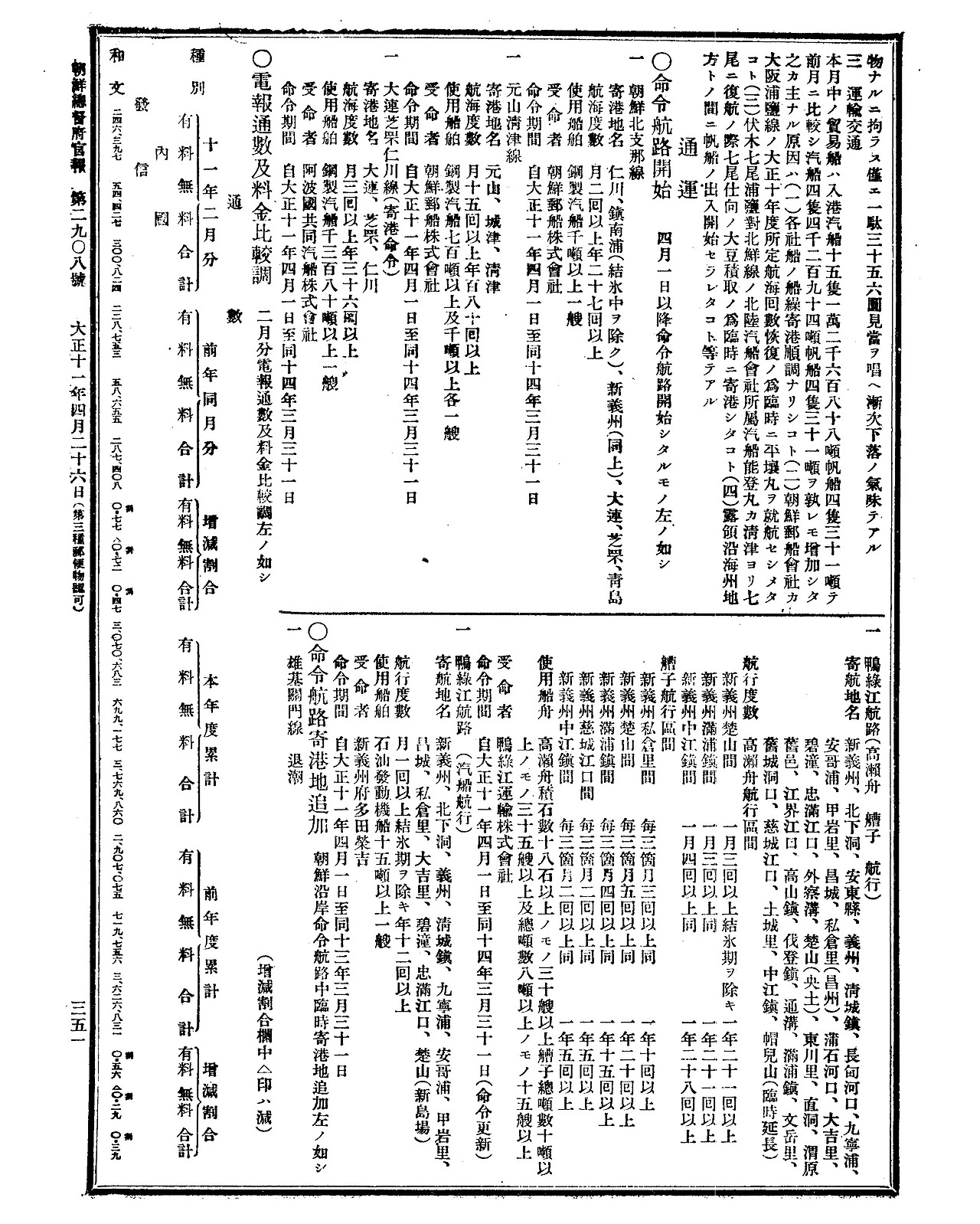 제주-부산, 목포를 연결하는 노선에 투입된 배는 주변 항구를 모두 들르는 형태로 운영됐다. 부산에서 다시 다른 지역으로 움직이는 노선은 처음 인천과 신의주 등을 목적지로 구성됐다. 원진‧청진항이 언급된 것은 『조선총독부관보』1922년 4월 26일 정규호 2908호 ‘명령 항로 개시’에서다. 당시 개시된 항로는 인천과 진남포(결빙 때 제외), 신의주(〃), 다이렌(대련), 즈푸(지부‧엔타이 연대 옛 지명), 칭타오(청도)를 월 2회, 연 27회 이상 운항하는 조선북지방선(1000噸‧톤 음역어 이상)과 원산청진선(월 15회 이상 연 180회 이상 운항‧700噸이상 1000噸 이상 각 1척), 다이렌지후인천선(월 3회 이상 연 36회 이상, 1380噸 이상 1척)이다.