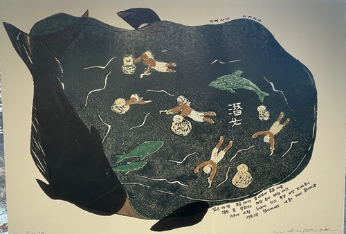 물소중이 정도나 걸쳤던 병담범주 속 해녀와 달리 홍진숙 작가가 옮겨온 해녀들은 검은 고무옷을 입고 있다. 진상할 전복을 채취하느라 매일이 고됐던 그 때와 달리 고래와 바다를 나누는 모습이 정겹기까지 하다. 한참을 작품 앞을 서성이다 홍진숙 작가와 눈이 맞았다.