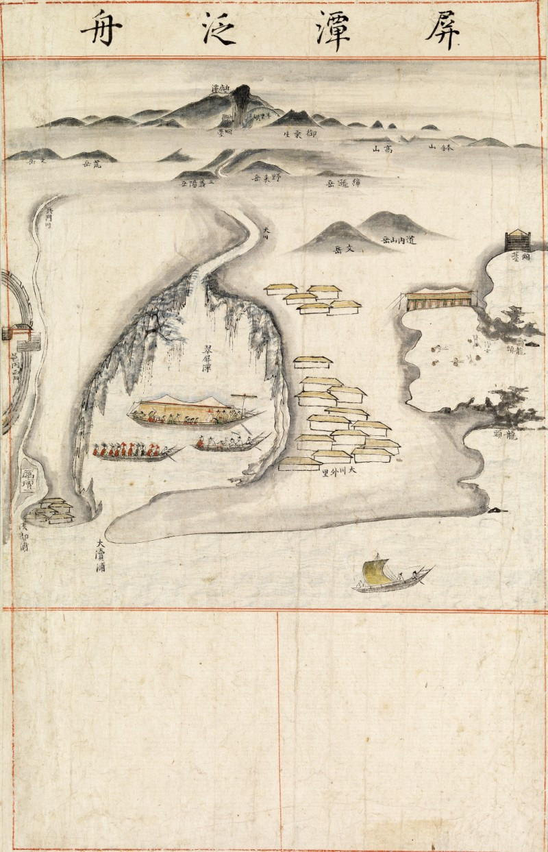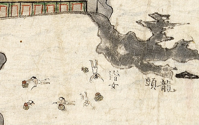 제주시 용연에서 뱃놀이를 하는 모습을 그린 ‘병담범주’에 해녀가 등장한다. 뱃놀이 현장과는 멀찍이 떨어진 곳에 해녀들이 물질을 한다. ‘잠녀潛女’라고 표기까지 되어 있다. 그 때도 흔치 않은 모습이었던 모양이다. 그림을 풀어 보면 양반들은 유흥을 즐기고 있지만 정작 제주 사람들은 힘겹게 삶을 유지하는 현실이다. 테왁에 의지해 생업에 몰두한 해녀들에게 같은 바다 위로 전해지는 웃음 소리며 장구 장단이 흥겨웠을 리 없다.