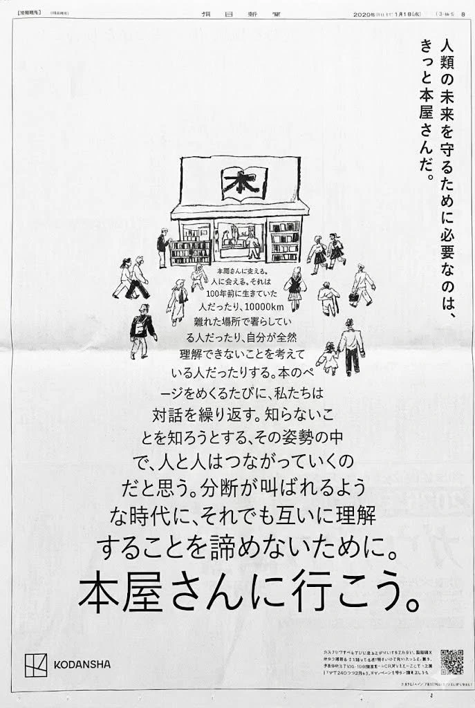 올해 고단샤의 광고를 처음 봤을 때, 가슴 한구석이 묵직해지는 것을 느꼈다. “인류의 미래를 지키기 위해 꼭 필요한 것은, 분명 서점입니다.”