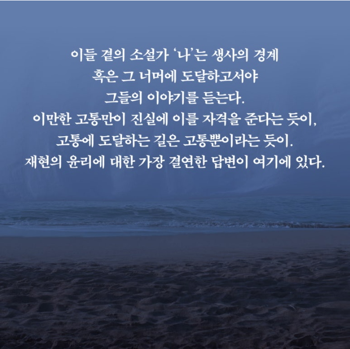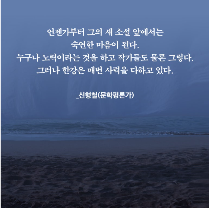 한강은 이 애도의 여정을 기억이 아닌 몸의 감각, 설명이 아닌 이미지, 재현이 아닌 증언의 미세한 떨림으로 끌어간다.