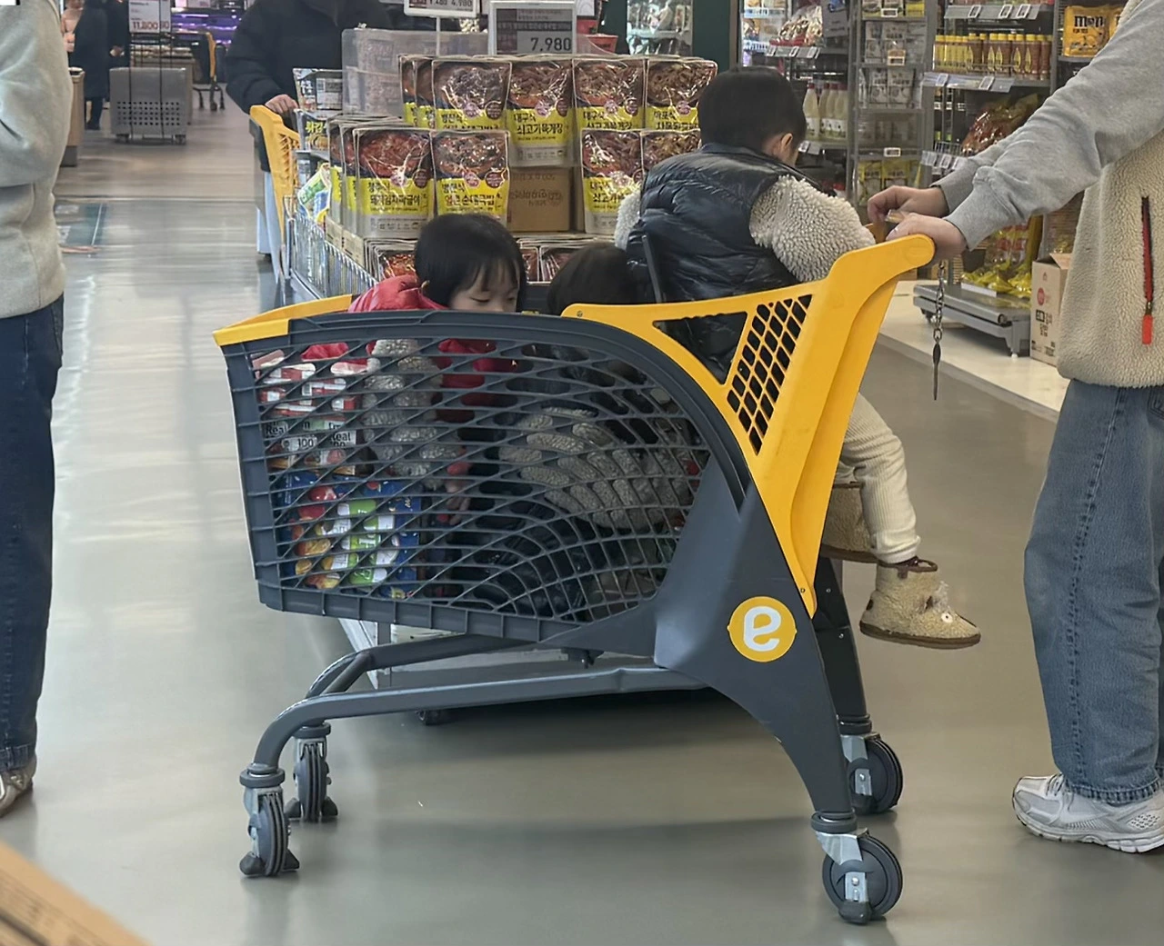 같은 말을 최소 세 번은 반복해야 하는 사이, “아빠 왔다!” 하는 엄마의 외침이 마치 “나 살았다!”는 구조 요청처럼 들린다. 결국 아이들 전부를 쇼핑카트에 붙들어 뒀지만 이내 이탈자가 발생한다. 정말이지 심심할 틈이 없는 풍경이다.