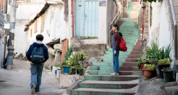 영화 Past Lives의 해성과 나영은 나란히 걷고 있었으나, 끝내 시선의 방향을 확인하지 못한 채 멈춰 선다.