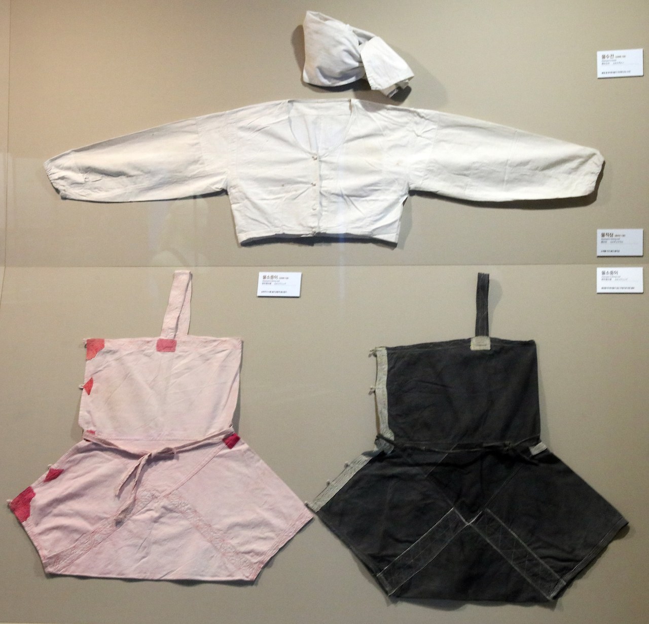 해녀들의 오래된 궤에서는 무명옷을 여러 겹 누벼 만든 물체 같은 겉옷이 종종 발견된다. 너나없이 배고팠던 시설에 무명으로라도 물옷을 만들 수 있을 정도면 '살 만 했다'. 밀가루 포대 등 기워 만들 수 있는 것은 모두 동원됐고 검은색 물을 들이기도 했다.