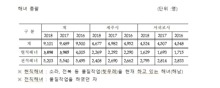 씁쓸하기는 하지만 진료비 혜택에 무임승차한 '가짜 해녀'홍역도 치렀다. 올 상반기 전직 해녀에 대한 일제조사에서 부적격자 57명이 가려졌다. 해녀증은 5년 이상 잠수경력이 있어야 발급되지만 부적격자 중에는 사망하거나(5명) 다른 지역으로 이사를 간(2명) 경우도 있는 등 관리에 허점을 드러냈다. 제주도는 조례에 따라 전·현직 해녀 진료비를 매년 50억원 이상 지원하고 있다. 1인당 평균 70만원, 많게는 400만원이 넘는 진료비 혜택을 부담하며 무조건 해녀를 양성할 수 만은 없는 이유다.