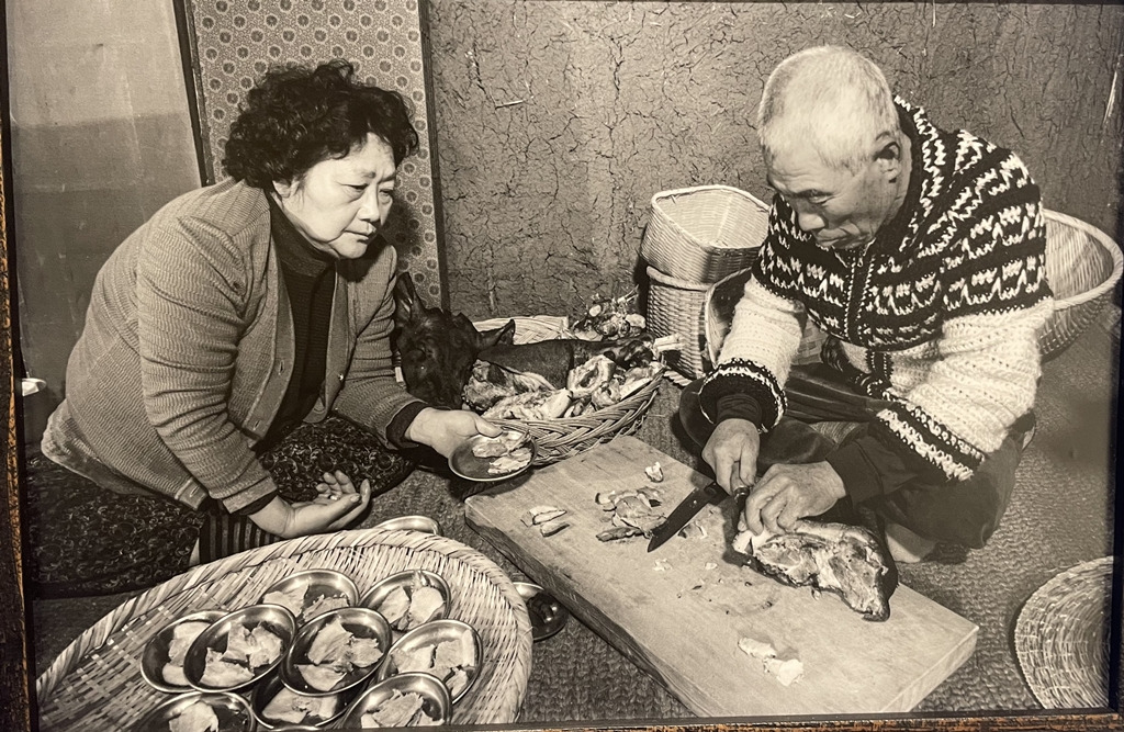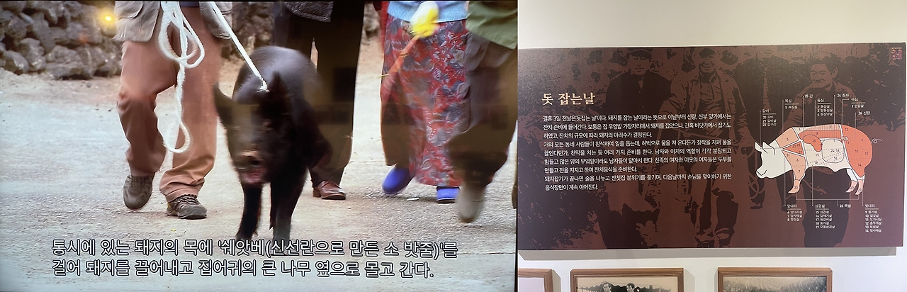 먹고 살기 힘들었다면서 가문잔치까지 몇 날 며칠 판을 벌일 수 있었겠냐 싶지만 그래서 더 떠들썩하게 잔치를 했어야 했다. 지금처럼 쉽게 만날 수 있는 환경도 아니었고 아는 이의 소개나 이웃 동네에 사는 이성과 만나 부부의 연을 맺었던 터다. 4.3과 한국전쟁 등을 거치면서 마을이 해체되거나 사라진 뒤 다시 모였던 과정 속에서 ‘괸당(친족)이 된다’는 것은 특별한 의미일 수밖에 없다. 모처럼 고기를 나눠 먹는 자리에 필요한 참여인원과 역할을 배정했다는 점은 유대 강화와도 연결된다. 딸도 팔고, 아들도 팔면서, 왁자하게 잔치를 벌였다고는 하지만 정작 살고자 했음이 간절하게 드러나는 의식이 아니었을까.
