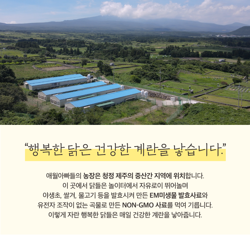 "우주에서 가장 맛있는 계란 '애월아빠들'입니다" 자신감도 우주 최강인 '애월아빠들'은 제주웰빙영농조합법인의 브랜드입니다. 2대째 양계업을 잇고 있는 이욱기 대표를 주축으로 행복하고 건강한 식탁을 위해 아빠 1호에서 6호까지, 그리고 새로 만든 영역을 책임지는 아빠들까지 하나둘 손을 보태 만들고 있습니다. '동물복지'라는 개념을 도입하면서 396㎡에 2만 마리나 키우던 닭을 3000마리까지 줄이는 엄청난 결정을 했습니다. 지금은 소비자들에게 직접 배송하는 시스템과 온라인 플랫폼까지 영역을 확장하고 있습니다. 머리 속에서 구상하던 것을 실현에 옮기고 결과란 것을 손에 넣기까지만 15년이 걸렸다고 합니다.