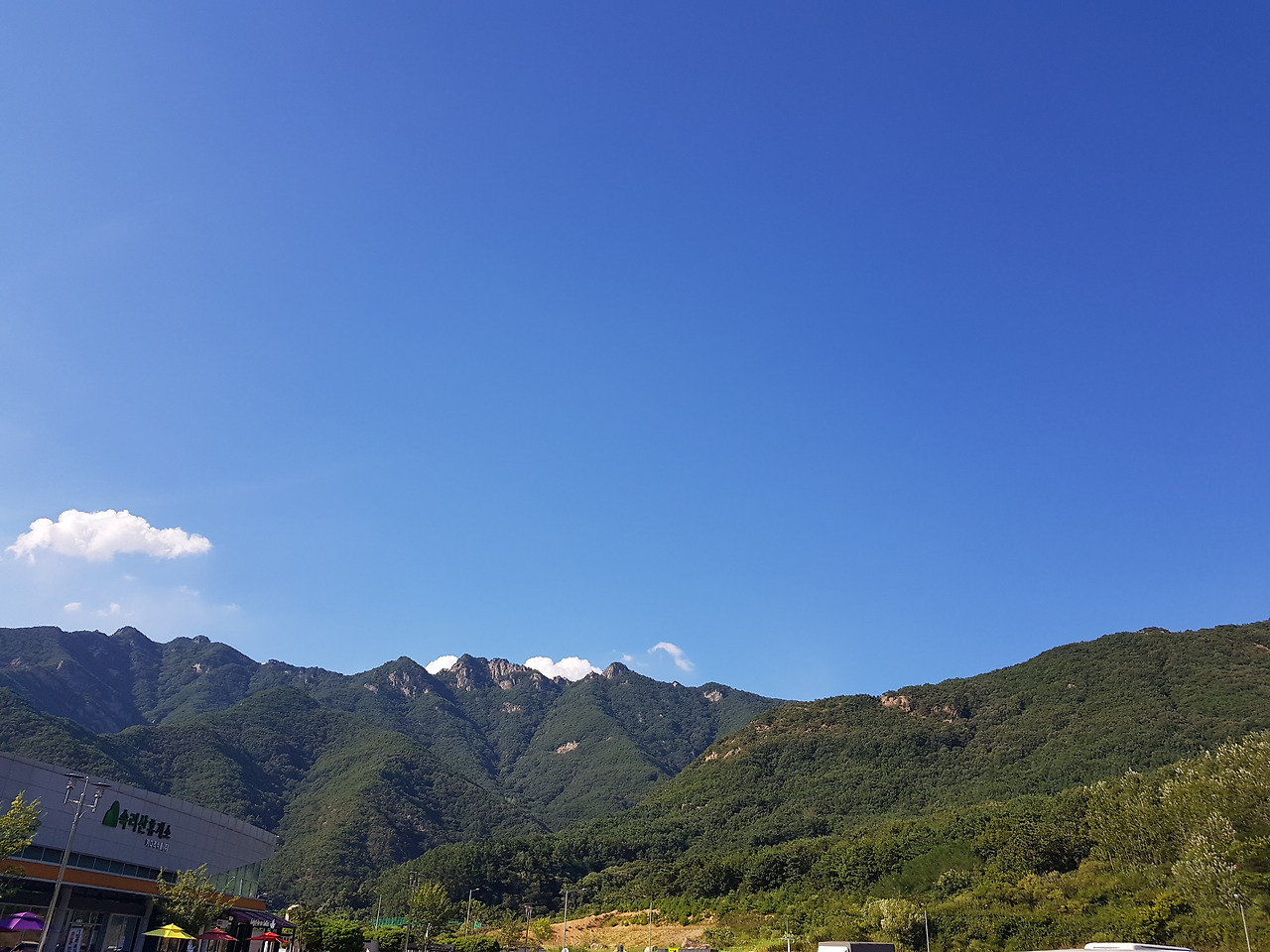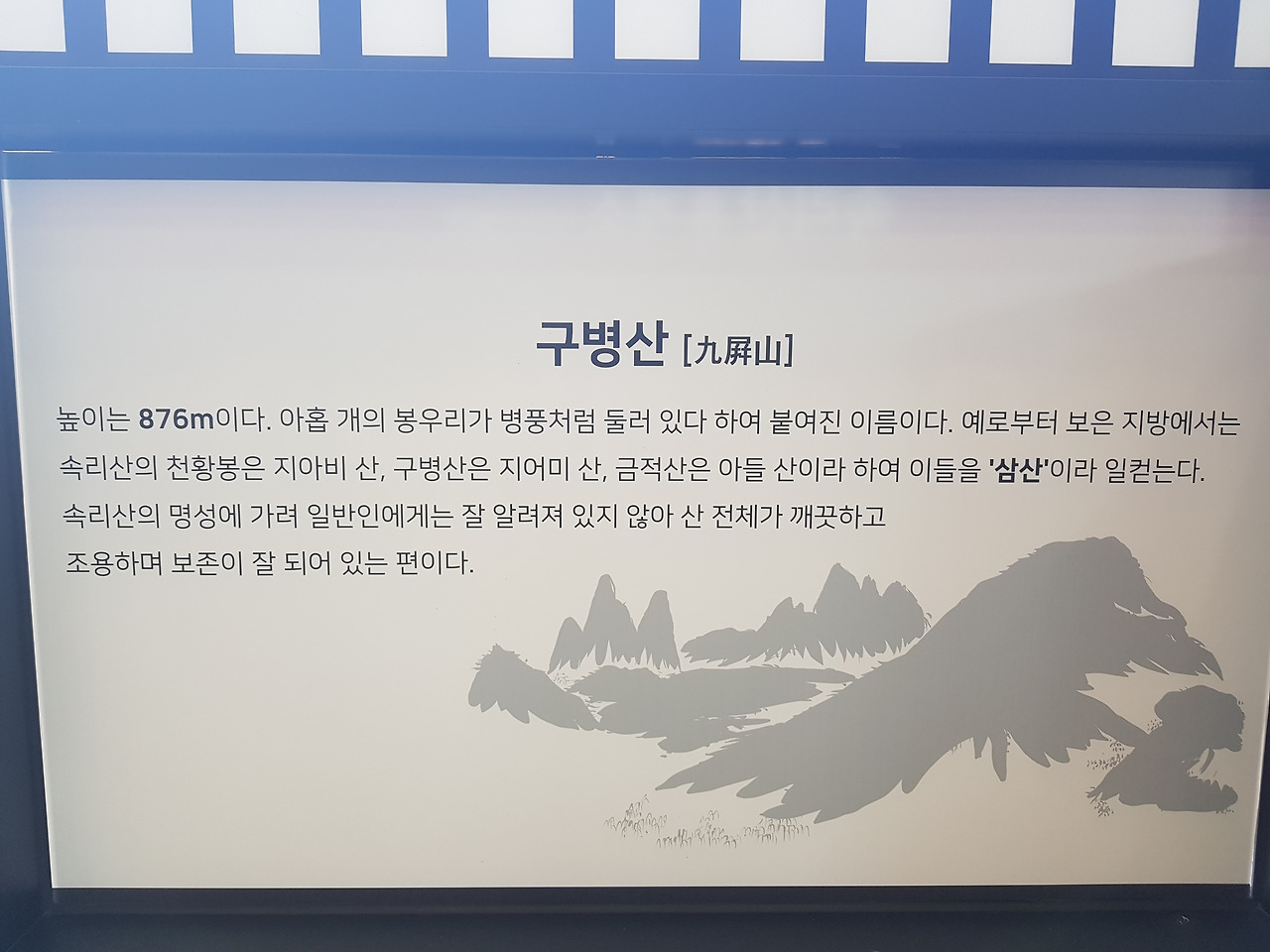 그런데 얼마 전 놀라운 산을 보았다. 한적한 고속도로 휴게소에서, 휴게소 건물 창밖으로 펼쳐진 구병산이다. 그러니까 그 휴게소 이름도 구병산휴게소일 것이다. 실은 산을 본 게 아니라 산을 설명하는 안내문을 본 것이고, 그 안내문 때문에 산을 (다시)본 것인데ᆢ