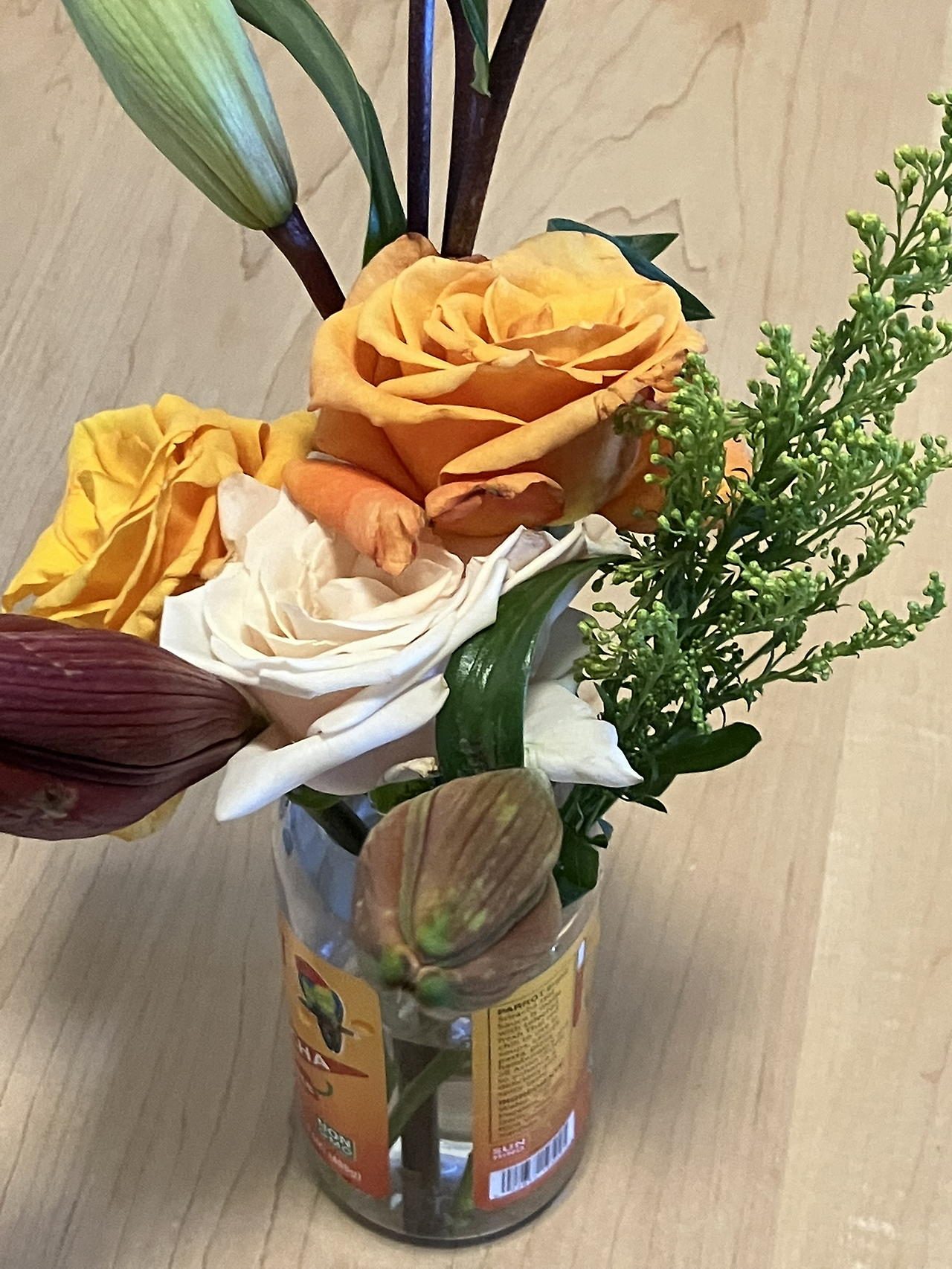 학교에서 직접 꽃다발을 만들 수 있는 행사를 하길래 가지고 와서 마땅한 꽃병이 없길래 굳이 핫소스 통을 개조해서 며칠 더 이 꽃들을 감상하려고 했다. 버스를 타면 20분 만에 오는 거리를 40분 동안 굳이 걸어 다닌다.
