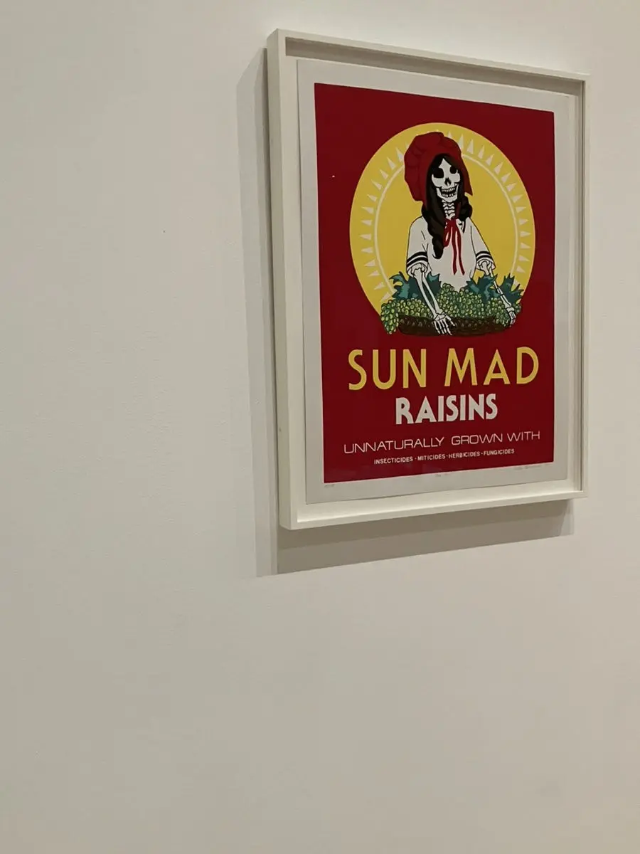 예술은 사회적인 문제에 대해서 목소리를 낼 때 가장 효과적인 방법 중 하나가 될 수 있다. 그걸 잘 보여주는 게 이 작품이라고 생각했다! 환경 문제와 농업 노동자들의 착취를 비판하기 위해 만든 실크스크린 판화인데, 실제로 유명한 ‘sun-maid raisins’ 브랜드의 로고를 패러디하면서, 원래 모델인 소녀 대신 해골 여성의 모습을 삽입했다.