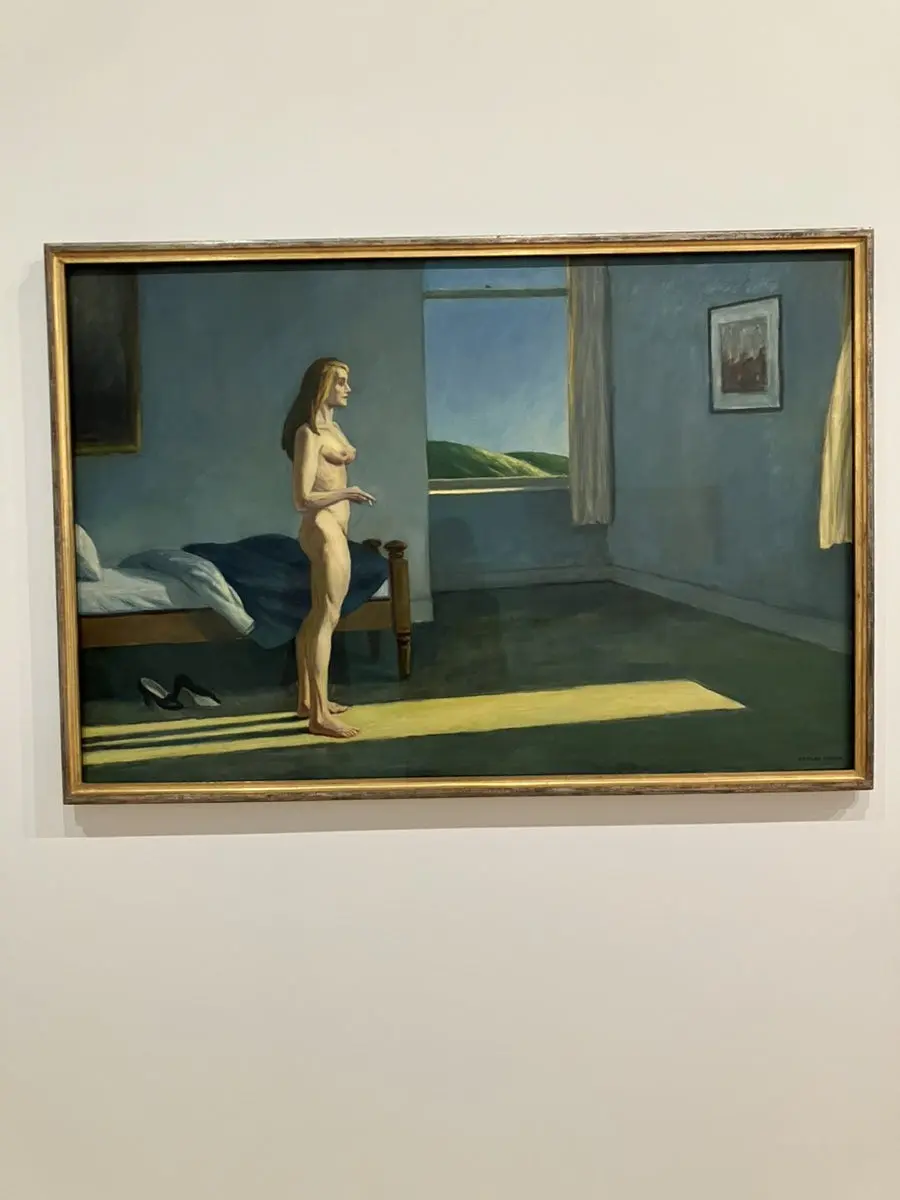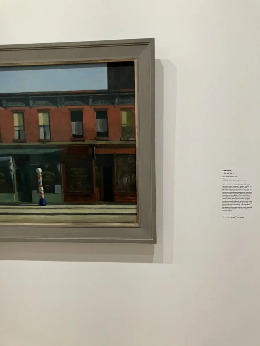 뉴욕 7번가 건물들의 단면을 아침 햇살 아래 담담하게 포착한 그림. 정적인 거리 풍경, 인물의 부재, 낮은 햇살과 긴 그림자는 도시의 외로움과 고요함을 강조한다고 한다. 특이한 점은 가게에 있는 모든 사인을 다 지워 버렸다는 것이다. 그래서 우리는 얼핏 봤을 때 여기가 뉴욕 7번가인지 알 수가 없다. 이건 전에 미술 교양에서 배운 것 같은데 .. 더 기억이 안 나서 아쉽다.