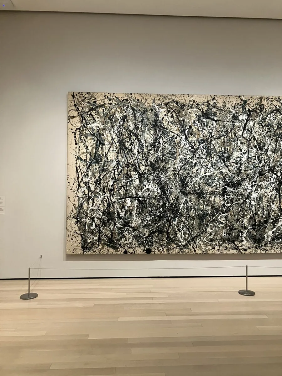폴록은 붓도 사용하지 않고, 캔버스를 세워서 그리지도 않았다. 바닥에 캔버스를 놓고 물감을 흩뿌리고, 흘리고, 때로는 튀기면서 그림을 완성하는 드리핑 (dripping) 기법을 활용했다고 하는데, 자세히 보면 캔버스 전체에 균등하게 색이 분포되어 있어서 그림을 봤을 때 여기가 중심이다! 라고 하는 전통적인 구도 (중심, 초점) 가 없다는 것을 알 수 있다.