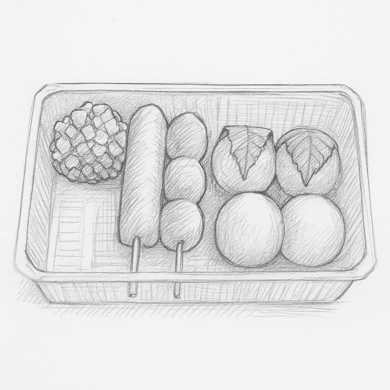 "나, 할머니를 못 봐서 기분이 안 좋아. 오늘은 많이 사 줘. 아지사이(紫陽花:수국) 죠나마가시랑 다이후쿠(大福:팥소를 넣은 찹쌀떡)랑 미타라시 당고(みたらし団子:간장소스를 발라서 구운 경단)랑..."